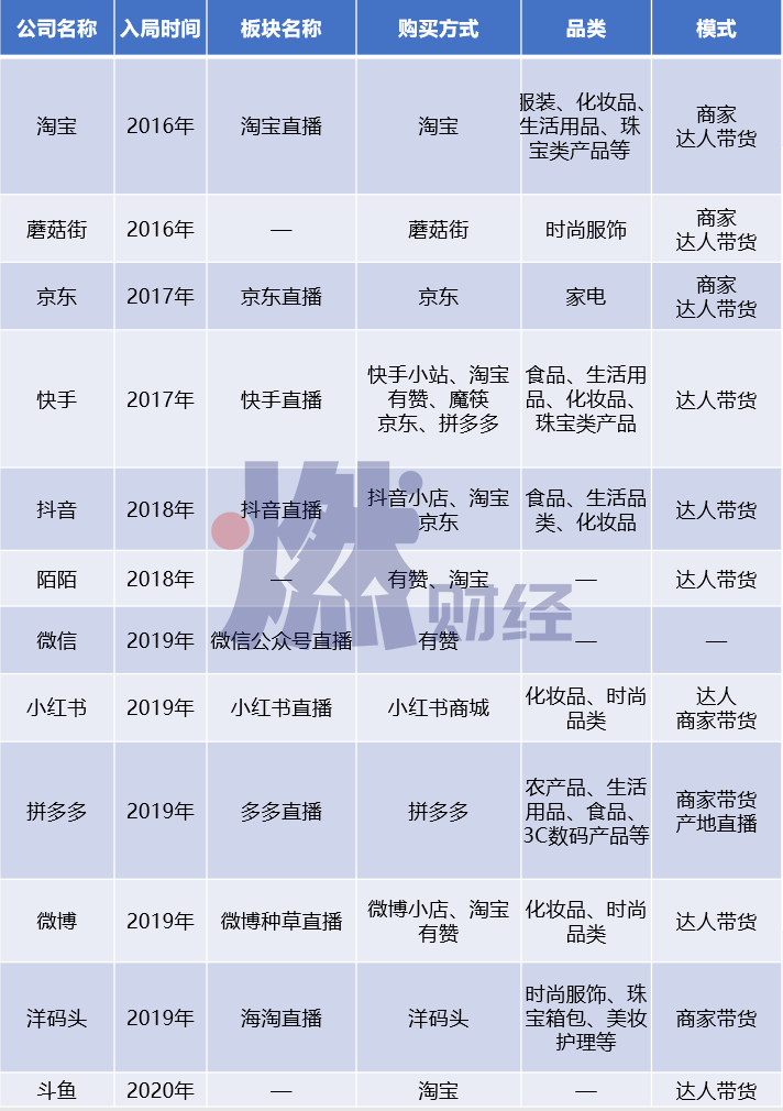 從這份名單可以看出,早期入局的公司多為電商平臺,包括淘寶、蘑菇街、京東等,隨后擴(kuò)展至快手、抖音等短視頻平臺,2019年以來入局的公司類型更為廣泛,包括微信、微博、小紅書、斗魚等社交、直播等平臺,近日,百度也被曝出即將上線電商直播。