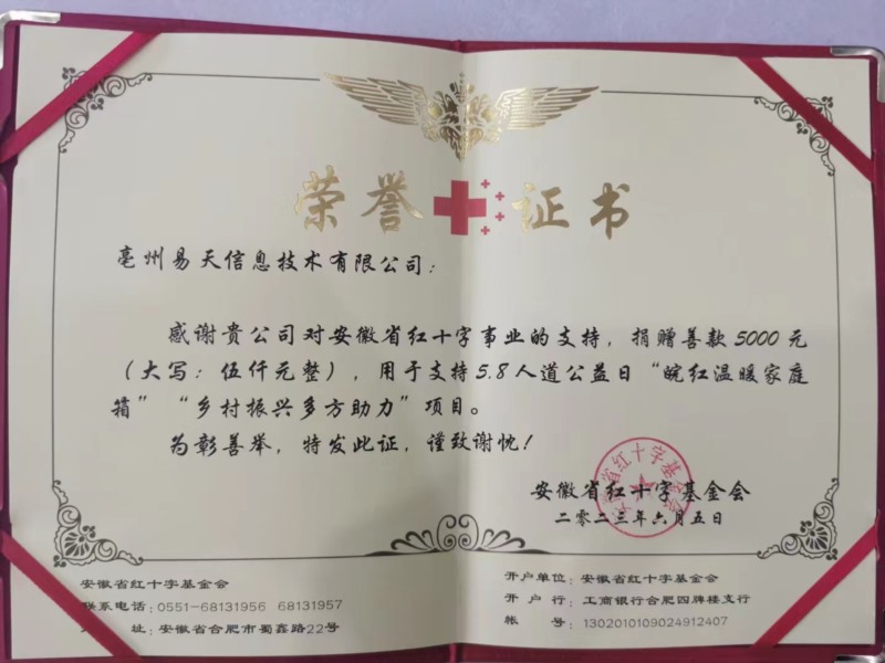 今年的5月8日是第76個世界紅十字日,中國紅十字會總會與騰訊公益聯(lián)合發(fā)起第二屆“5·8人道公益日”網(wǎng)絡眾籌活動。亳州易天科技通過亳州紅十字工作人員了解到活動后積極參與公益事業(yè)。捐款5000元,用于支持以支持5.8人道公益日“皖紅溫暖家庭箱”和“鄉(xiāng)村振興多方助力”。所籌善款將用于向全省困難群眾發(fā)放慰問物資。